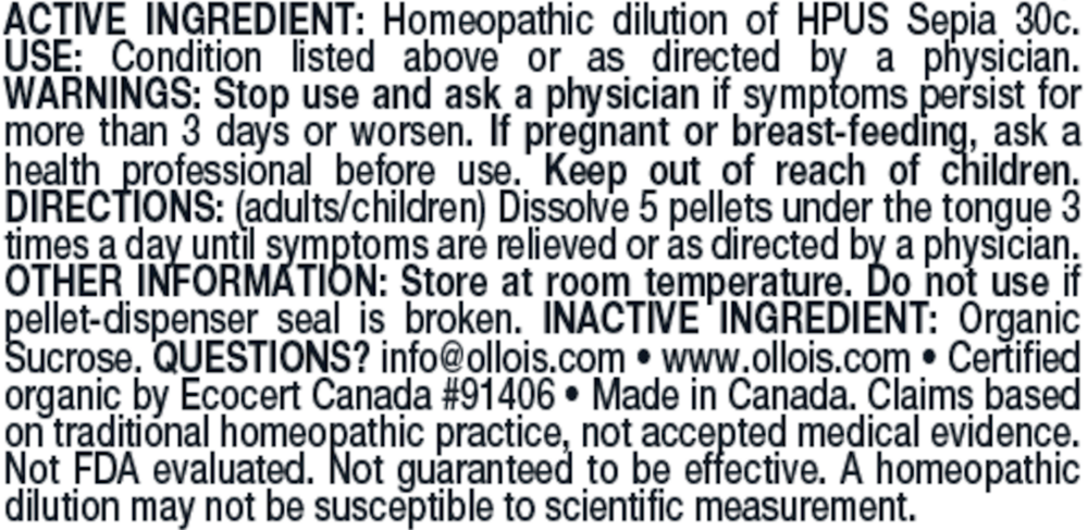 Homeopathic. Ollois organic certified and lactose free Sepia 30C is traditionally used for: menstrual symptoms and moodiness.†