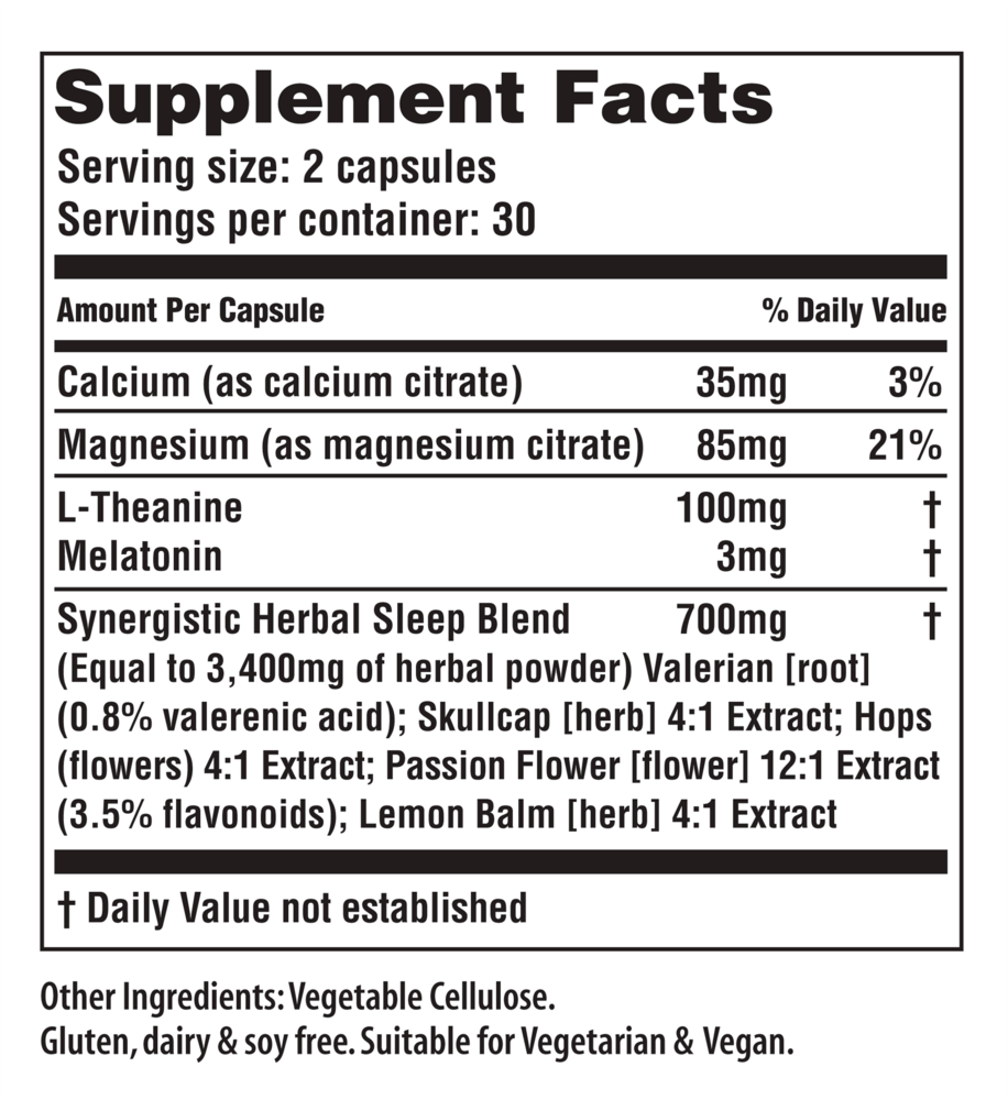 Theanine- An amino acid (from Green Tea but no caffeine) shown to help create relaxing Alpha brain waves so you can “turn off” and get ready to sleep.*