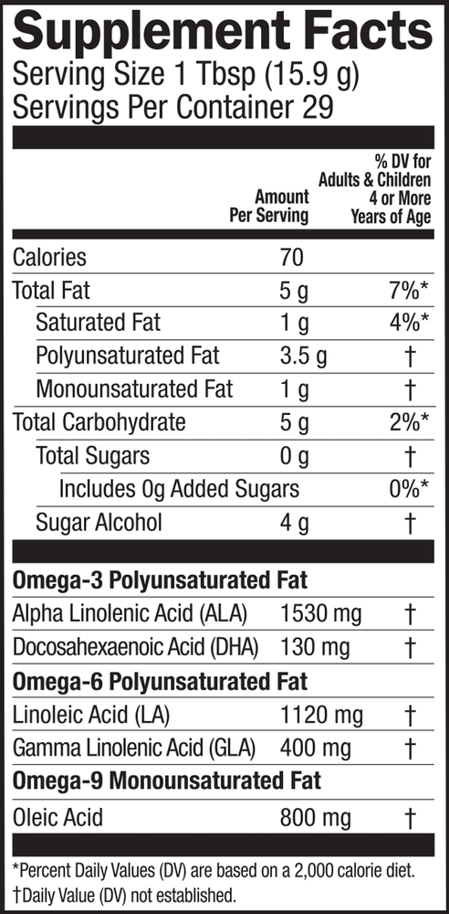 • 1,530 mg ALA Omega-3, 400mg GLA & 130mg plant-based DHA per Tbsp