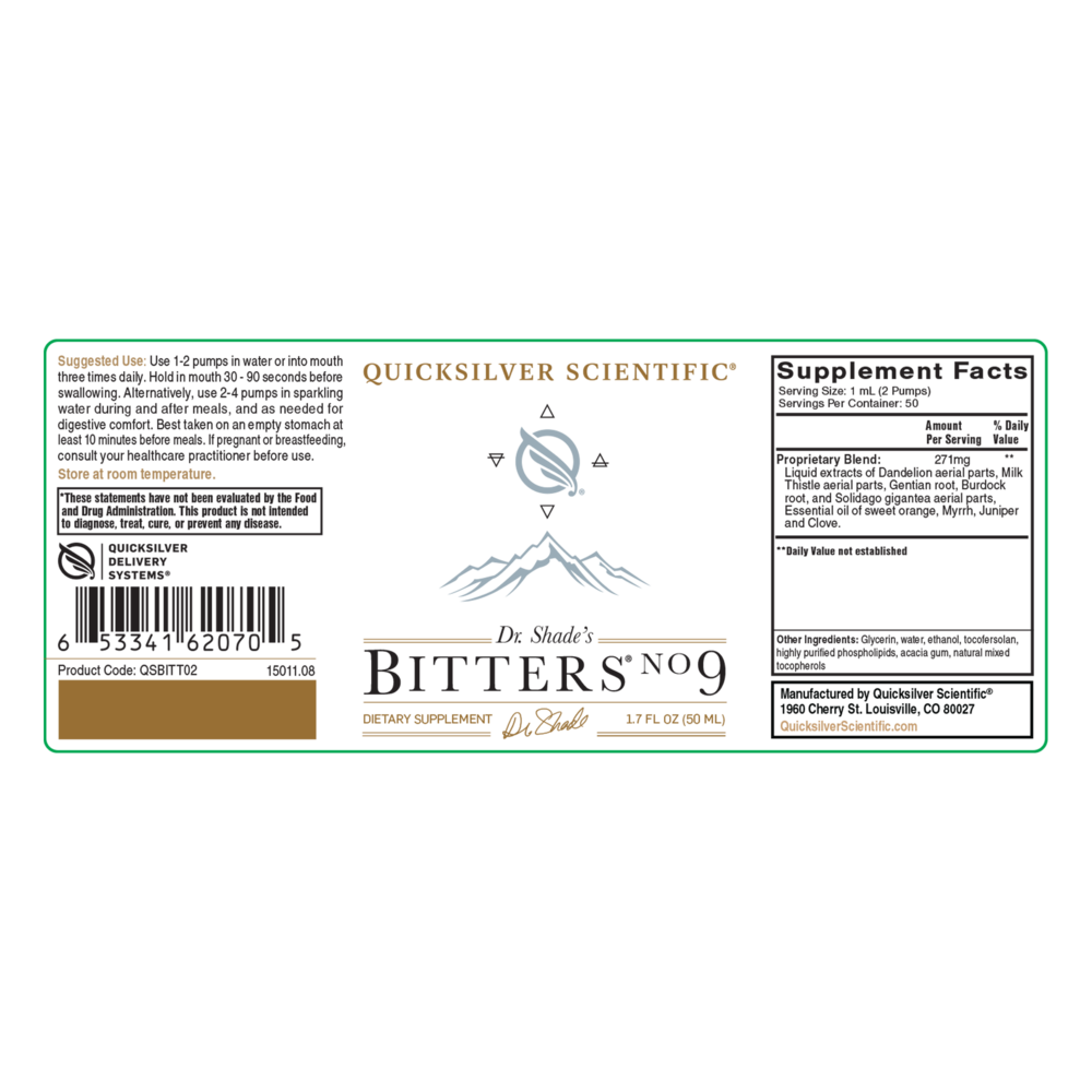 Each 1 mL of Dr. Shade’s Bitters No.9® delivers 271 mg of a proprietary bitters blend. A serving size is 2 pumps. Each bottle contains 50 271-mg servings.