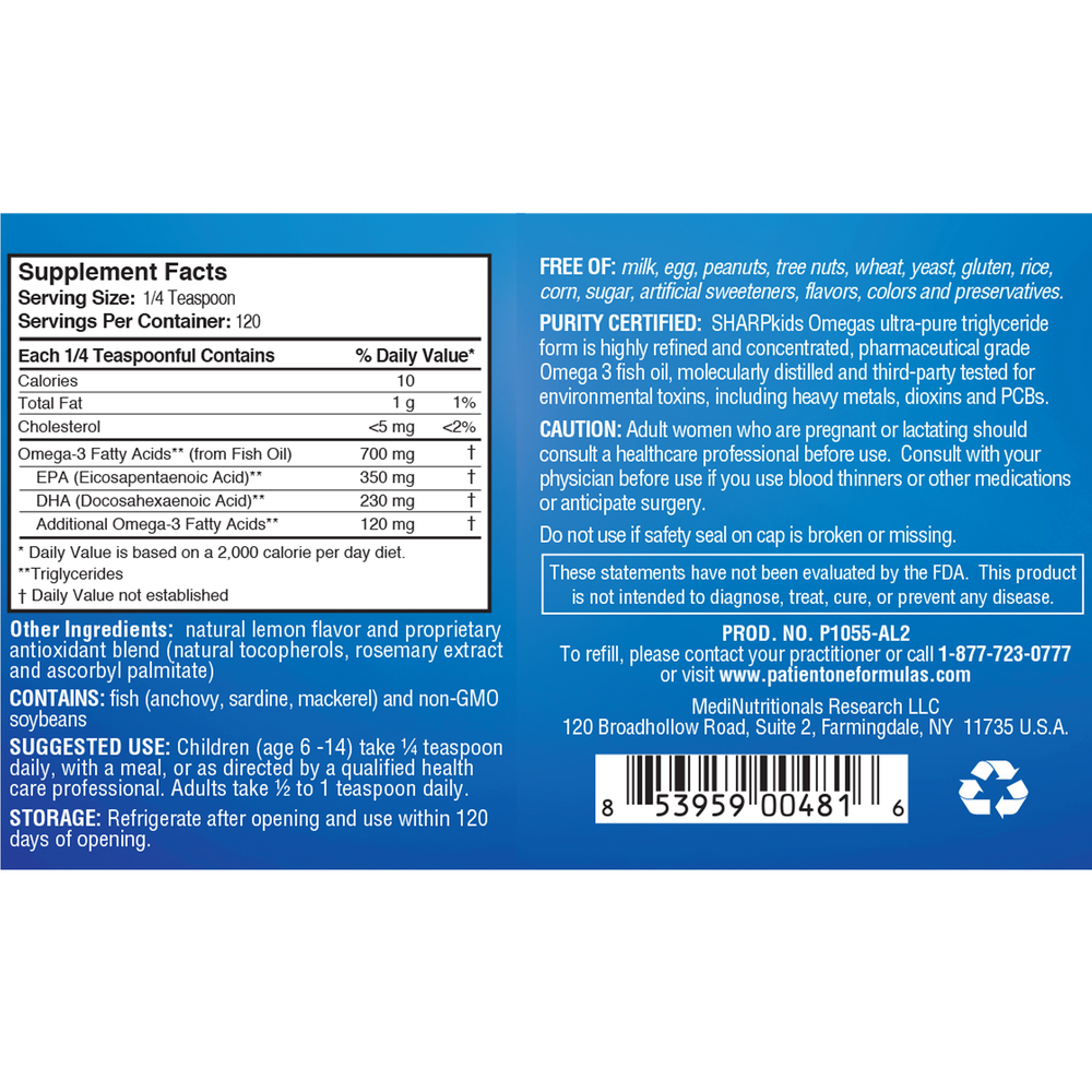 Patient One SHARPkids Omegas supplies highly purified and concentrated Omega-3 fatty acids as triglycerides in an easy-to-take liquid form. SHARPkids Omegas is formulated in a high EPA (eicosapentaenoic acid) to DHA (docosahexaenoic acid) ratio for targeted health benefits, and also includes a proprietary antioxidant blend.