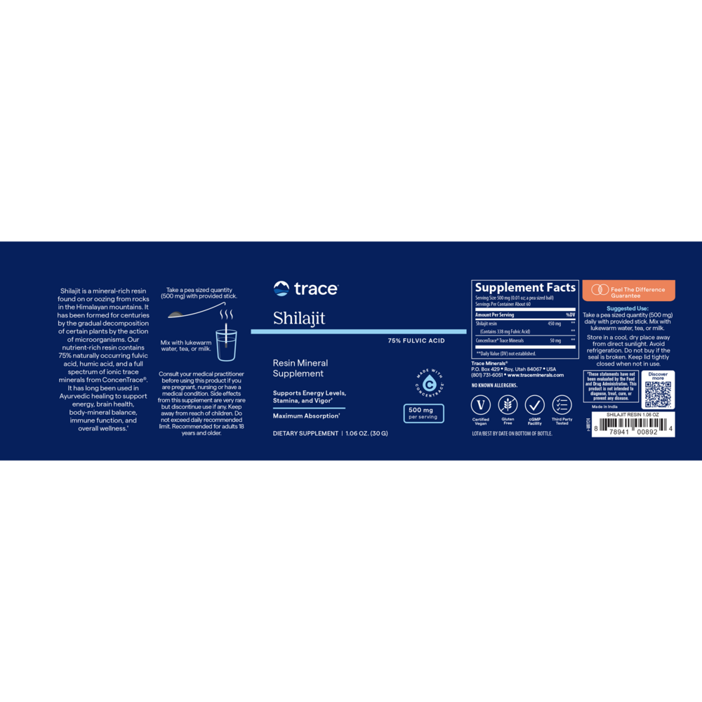 Shilajit is a mineral-rich resin found on or oozing from rocks in the Himalayan mountains. It has been formed over centuries through the decomposition of plant and animal matter. Our nutrient-rich resin contains 75% naturally occurring fulvic acid, humic acid, and a full spectrum of ionic trace minerals from ConcenTrace®. It has long been used in Ayurvedic healing to support energy, brain health, body-mineral balance, immune function, and overall wellness.*