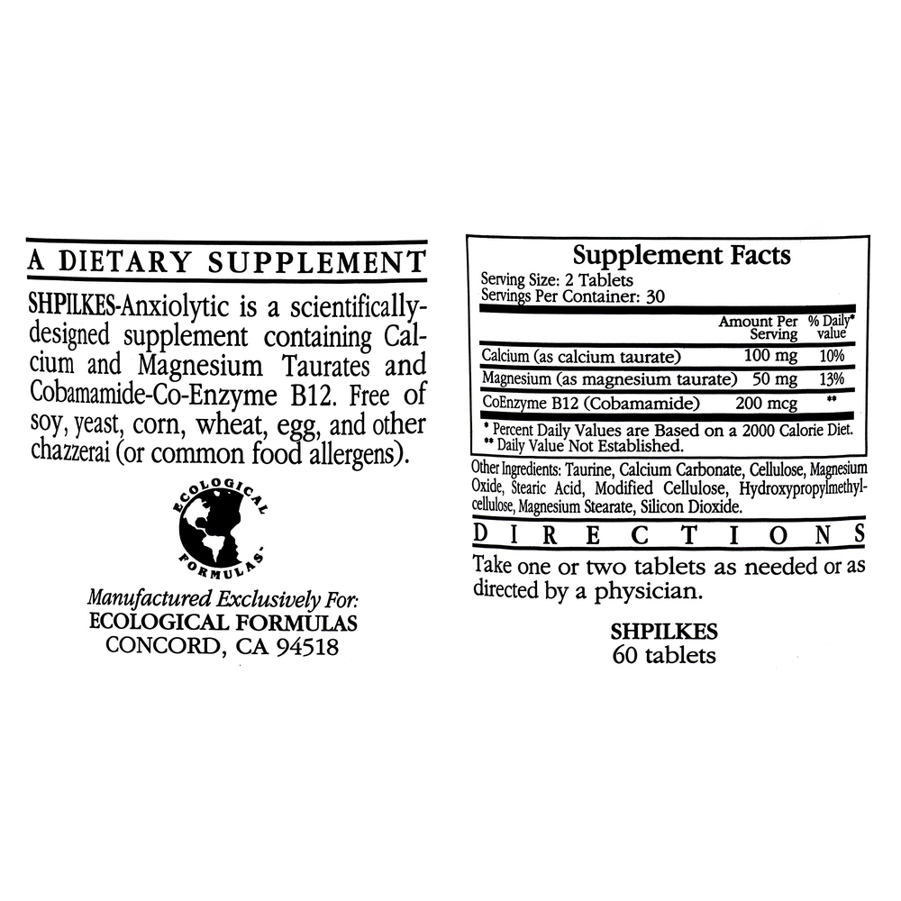 Shpilkes C/M Taurate by Ecological Formulas is a dietary supplement designed to support healthy mood.* The formula used to create Shpilkes C/M Taurate by Ecological Formulas blends calcium and magnesium taurates with Cobamamide-Co-Enzyme B12. These three ingredients work in concert to help address occasional stress and tension using all natural ingredients, in addition to assisting in the smooth operation of a wide range of functions, including cardiovascular functions and the metabolism of energy to prevent fatigue.*