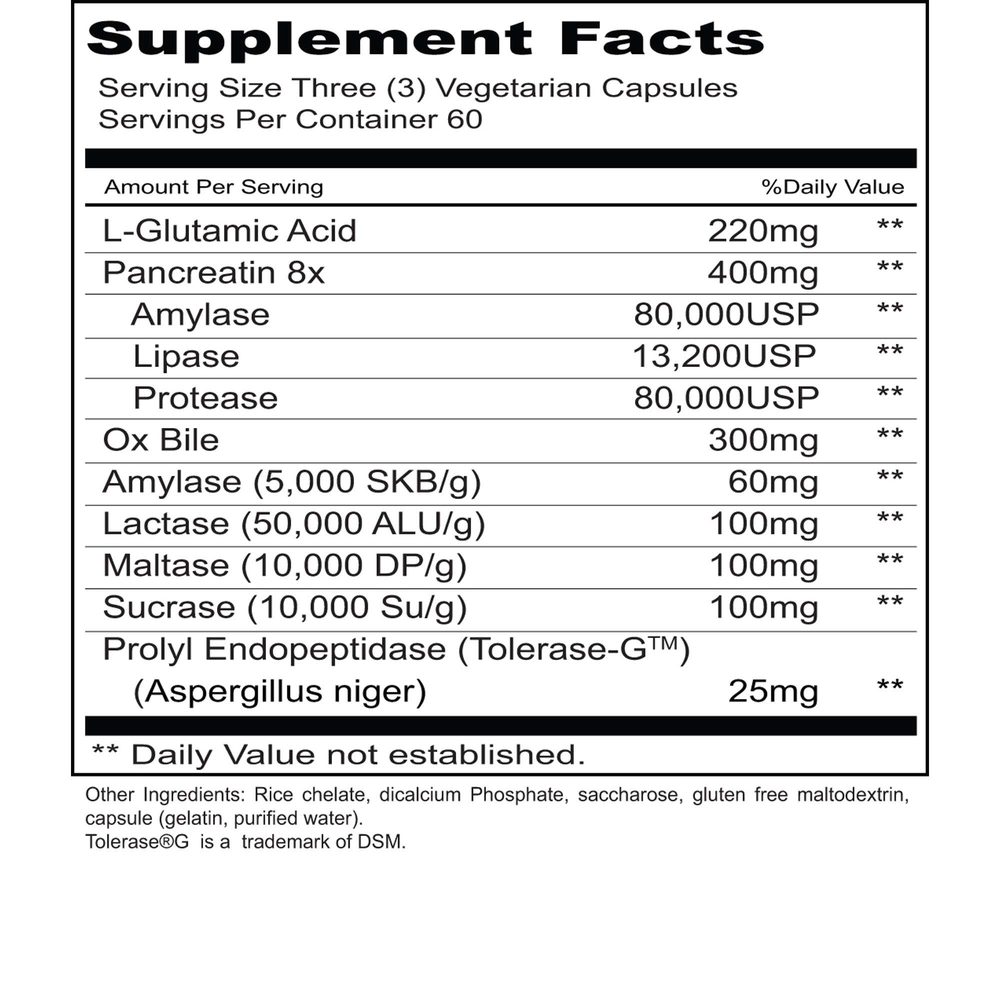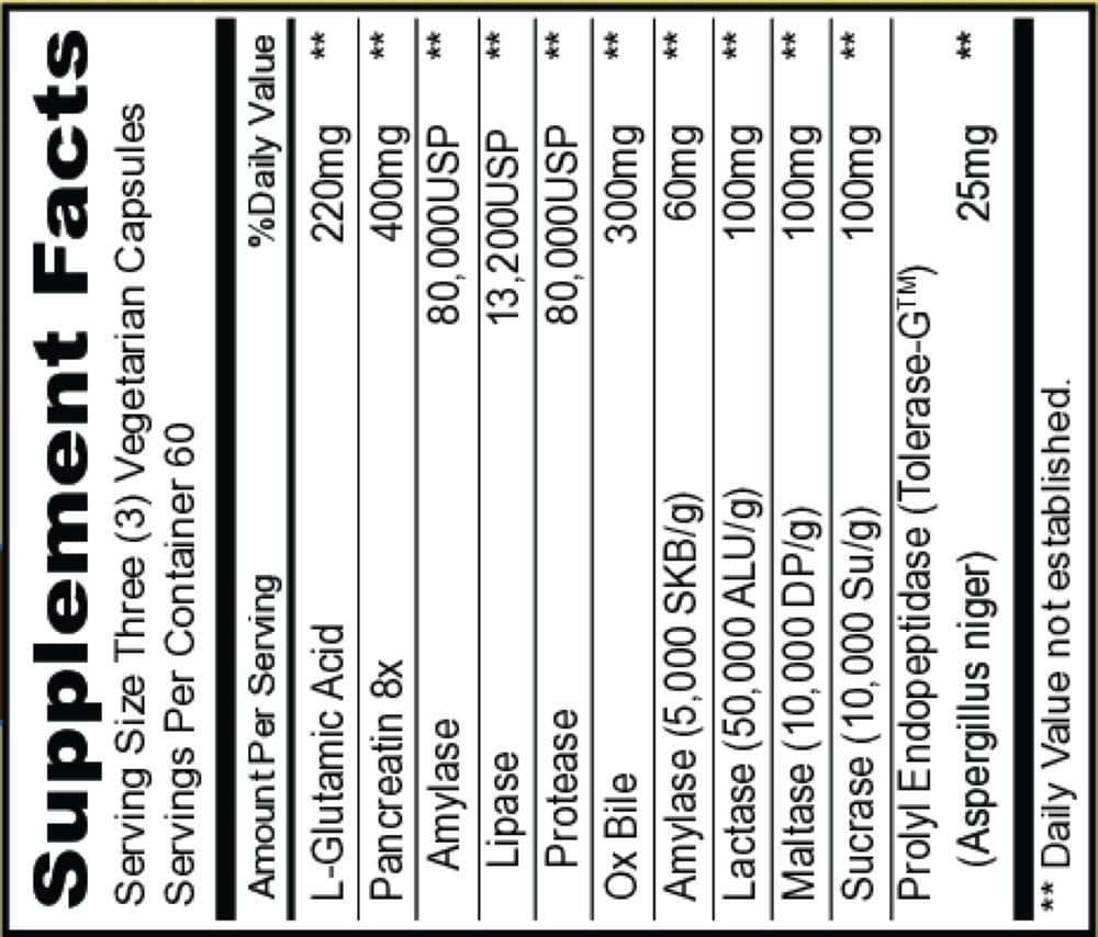 Healthy intestinal lining can produce the disaccharide enzymes necessary for proper digestion of foods that often cause mal-digestive distress. Proper digestion is also dependent upon the body's ability to produce healthy levels of gastric acid, pancreatic and or gallbladder bile. Support for these natural processes in the form of a comprehensive digestive enzyme is imperative during times of temporary digestive distress.*