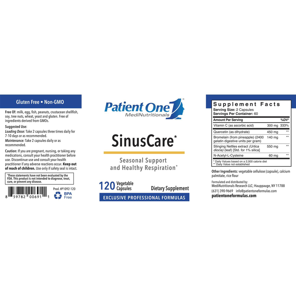Patient One SinusCare supplies a synergistic combination of micronutrients, bioflavonoids, enzymes, amino acids and herbs that provide multi-faceted support for immune function and respiratory health. This formula provides natural support and quick relief for discomfort associated with immune hypersensitivity and histamine release, including watery, itchy eyes, sneezing, runny nose and nasal congestion.