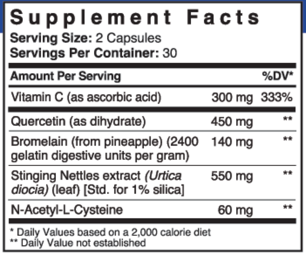 Quercetin, a powerful natural bioflavonoid with strong antioxidant activity, and vitamin C are beneficial for respiratory health. They provide support for stabilizing mast cells that store and release histamine and moderate an exaggerated immune response to allergens. Quercetin inhibits inflammatory enzymes and increases mucus secretion from gastric cells. Vitamin C has been widely studied and is commonly known for its supportive role in moderating the severity or duration of acute immune challenges. This nutrient appears to heighten the immune response, impacting T-cell proliferation. Vitamin C also synergistically improves the ability of quercetin to preserve and increase glutathione levels, supporting reduced oxidative damage. Increasing this potent antioxidant may help reduce nasal obstruction, rhinorrhea and ear fullness.