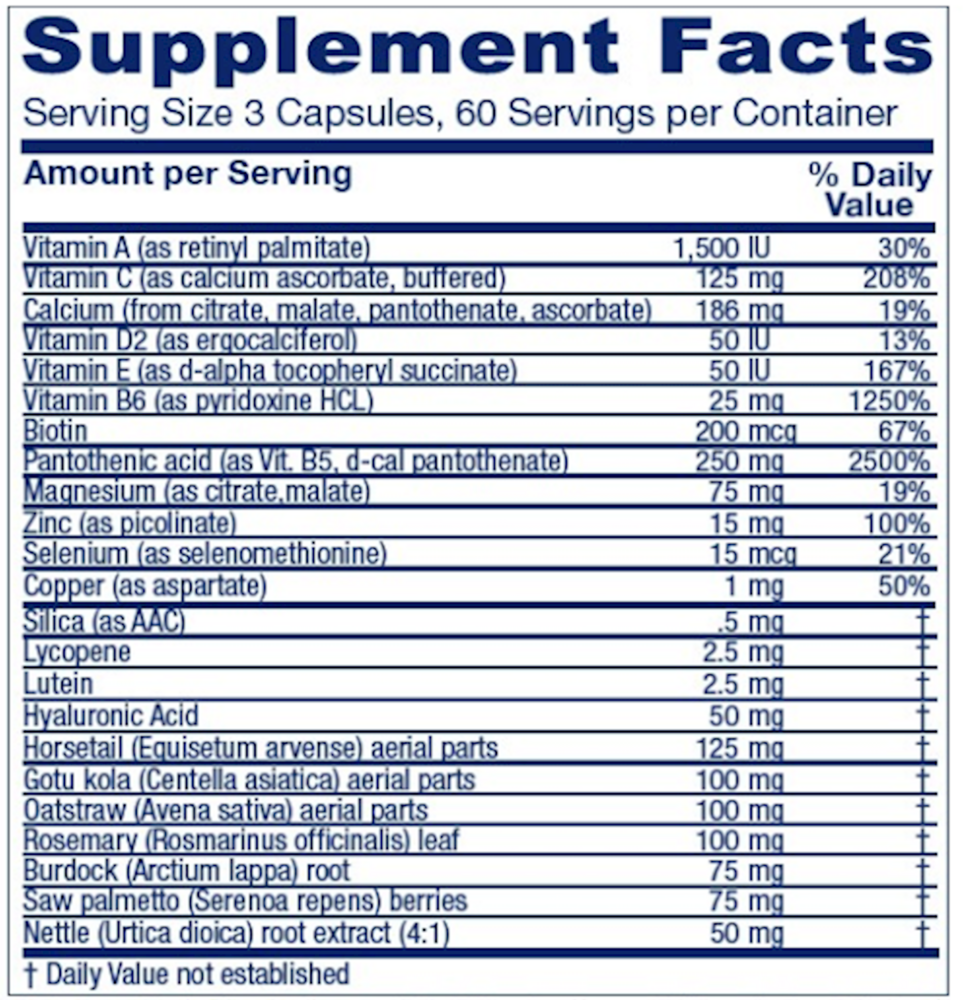 • Critical nutrients for the skin include optimal and easily absorbed forms of calcium, magnesium, Vitamin D, biotin, selenium and zinc*