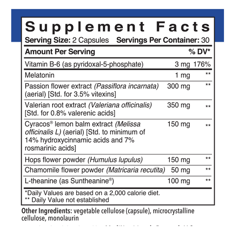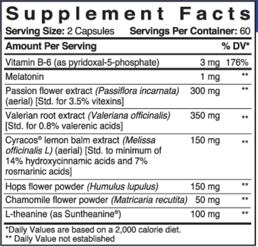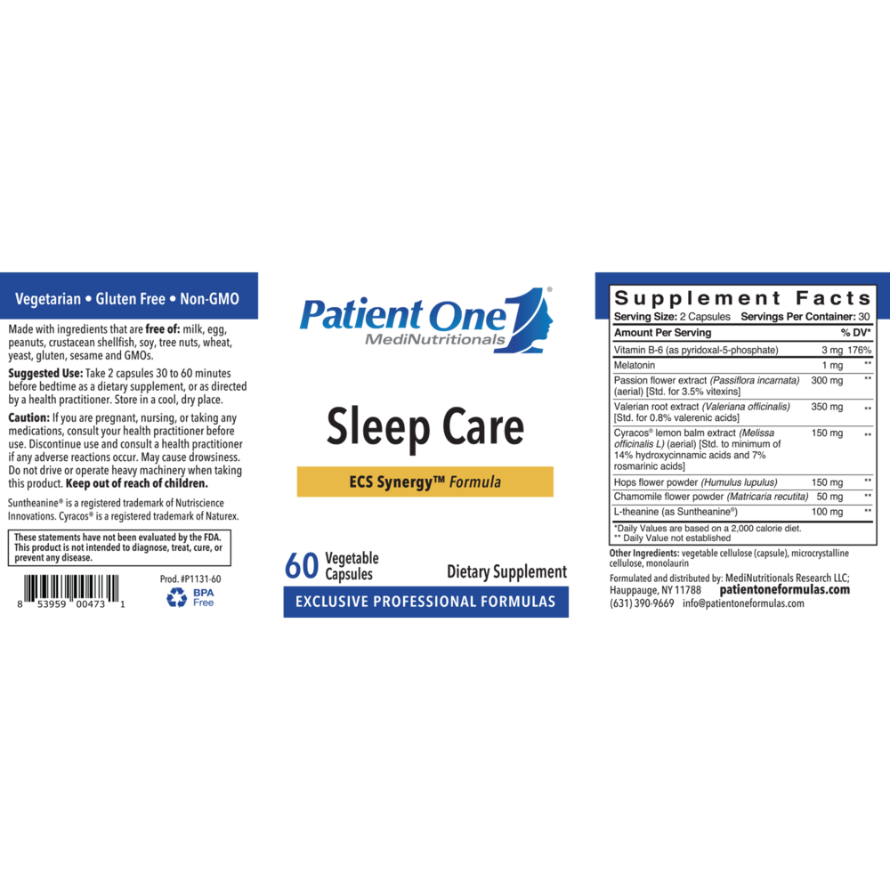 Patient One Sleep Care is formulated with a blend of synergistic nutrients to promote relaxation and restful sleep. Because several botanicals included in Sleep Care have been shown to interact with the body's endocannabinoid system (ECS), this formula is part of our ECS Synergy™ series. Specifically, lemon balm, valerian and hops act as ""cannabimimetics,"" natural substances that can interact with the ECS in a similar manner to endocannabinoids or phytocannabinoids. These ECS botanicals help calm and relax the central nervous system and restore balance in the body.