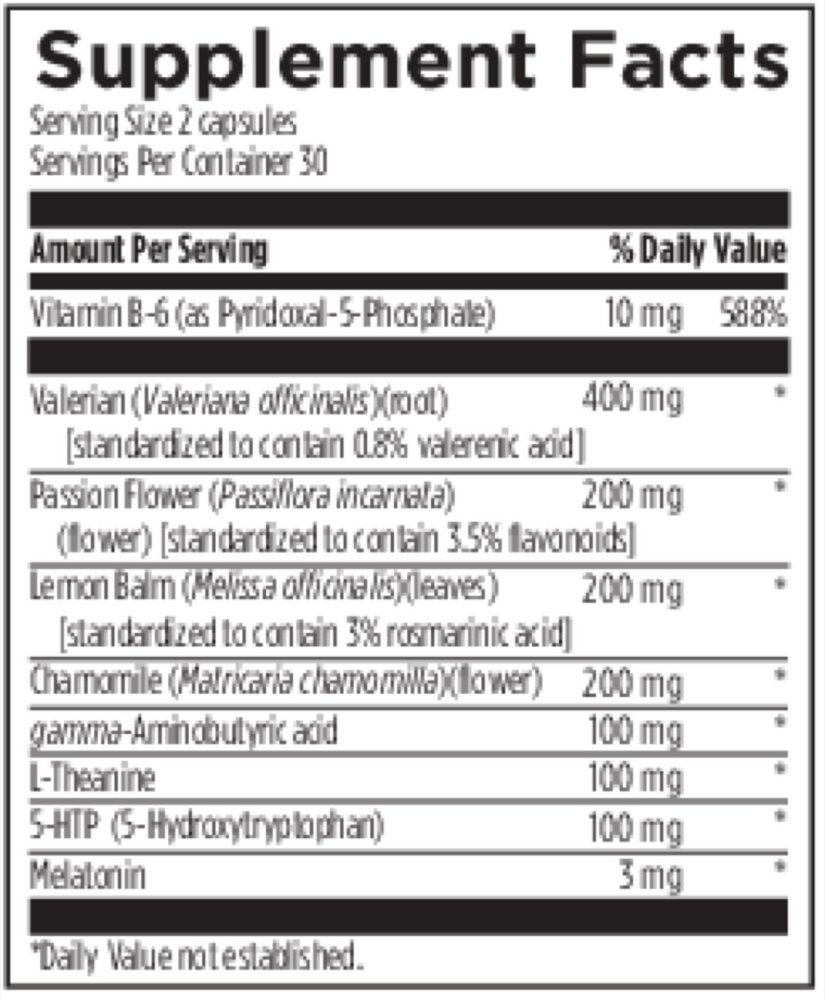 Key ingredients include botanicals that support nervous system function, PharmaGABA® (a proprietary form of GABA), L-theanine, melatonin, 5-HTP, and pyridoxal-5- phospate (activated form of vitamin B6).*