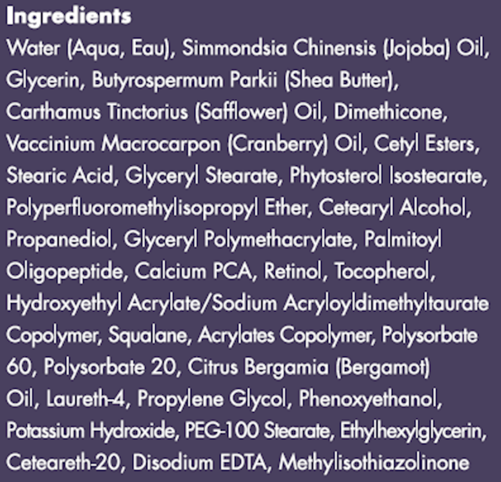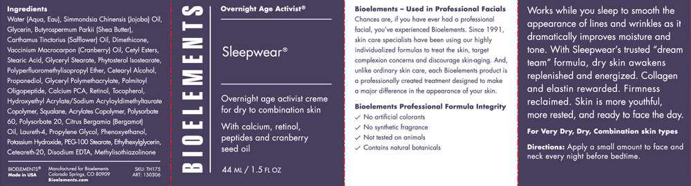 Sleepwear works overnight to smooth the appearance of lines and wrinkles as it dramatically improves moisture and tone. With Sleepwear's trusted "dream team" formula of calcium, retinol, peptides and cranberry seed oil, dry skin awakens replenished and energized. Skin looks more youthful, more rested and ready to face the day.