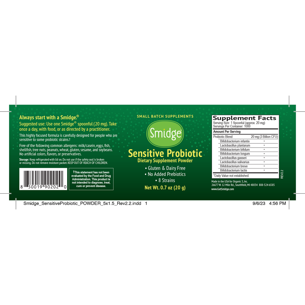 Smidge® Sensitive Probiotic powder is formulated to support your gut health, whether you have a super-sensitive digestive system or are looking to reinforce your real-food diet (formerly known as GutPro®). It’s clean, potent and therapeutic, with eight clinically-proven strains of beneficial, carefully calibrated gut bacteria. We’ve eliminated common probiotic strains that can cause histamine intolerance, D-lactic acidosis, irritation or reactions associated with commercial brands. There are no common allergens, additives, gluten, fillers or prebiotics — just 100% pure probiotics. This unparalleled, Non-GMO formula is based on years of research on digestive health and is compatible with real food diets. Needs refrigeration. Kick start your digestive system with Sensitive Probiotic powder today!