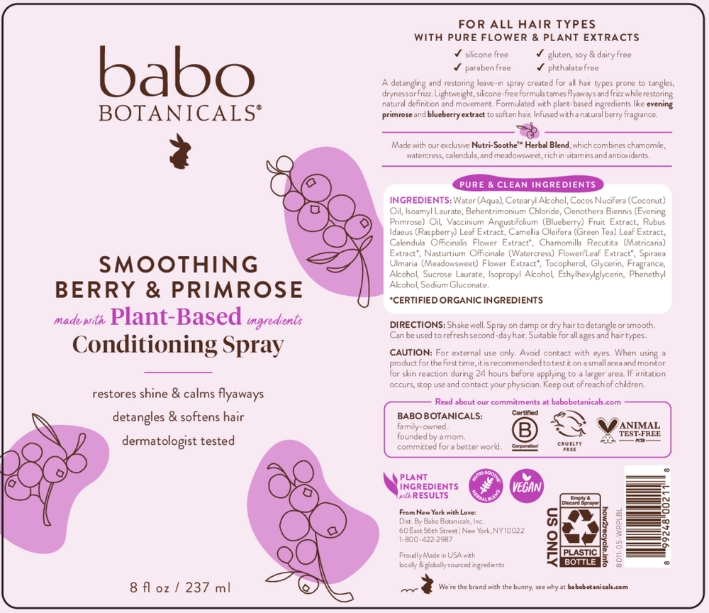Babo's Smoothing Detangling Spray is a non greasy, lightweight, leave-in-conditioner for damp or dry hair. Plant-based, botanical conditioners provide faster detangling and increased shine. This conditioner is also great for eliminating frizz, calming flyaways and preventing static. Instantly refreshes bed or hat head.