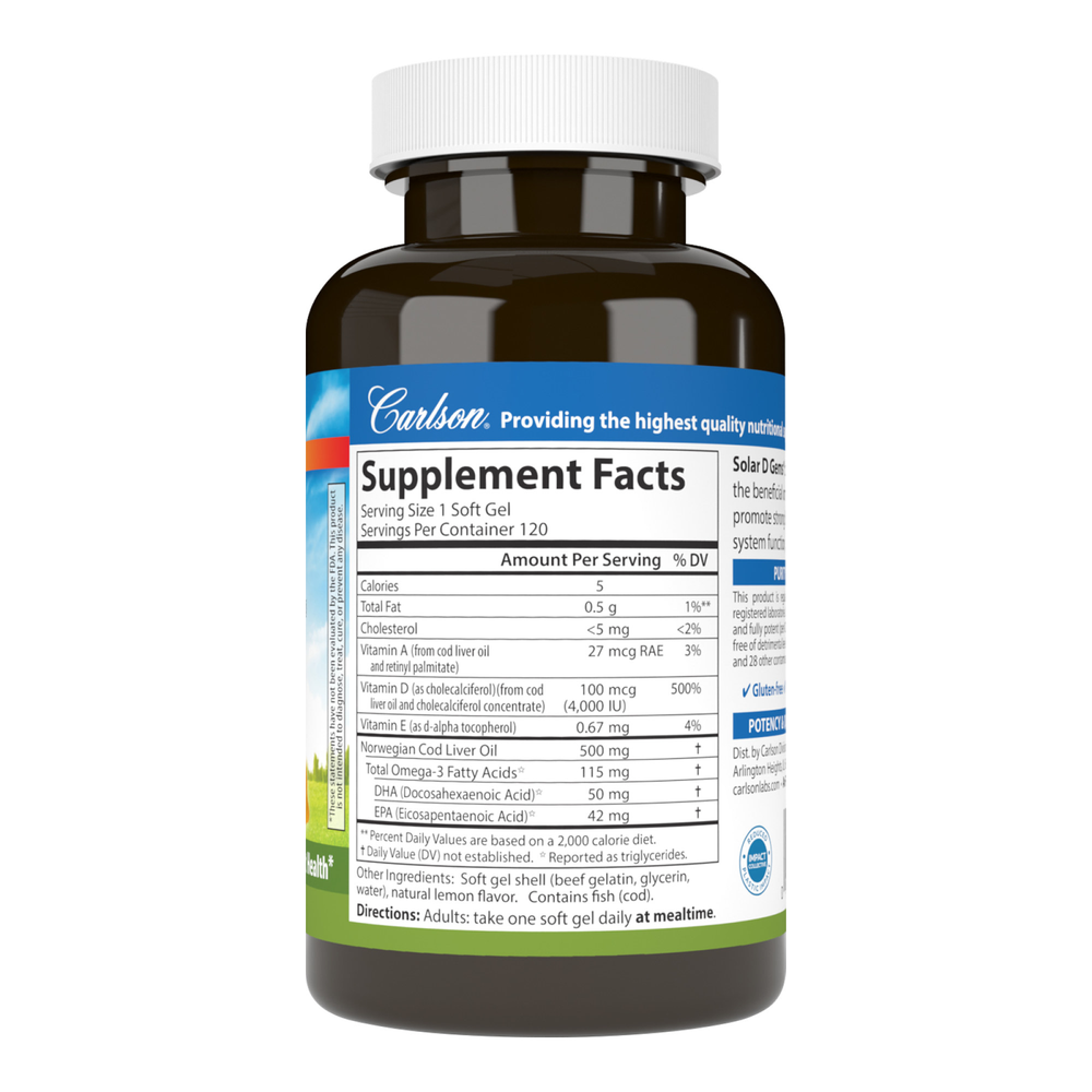 Solar D Gems® is a vitamin D3 supplement for those who don't get enough from food or the sun. Vitamin D is a superstar nutrient linked to many health benefits. What makes it so unique is that it's a vitamin you can get through food and also a hormone your body makes from the sun. Despite the multiple ways of getting vitamin D, many are still deficient due to changing seasons, sunscreen, skin color, age, and sun protection. Solar D Gems® also provides 115 mg of wild caught, sustainably sourced omega-3s, which support heart, brain, vision, and joint health.*