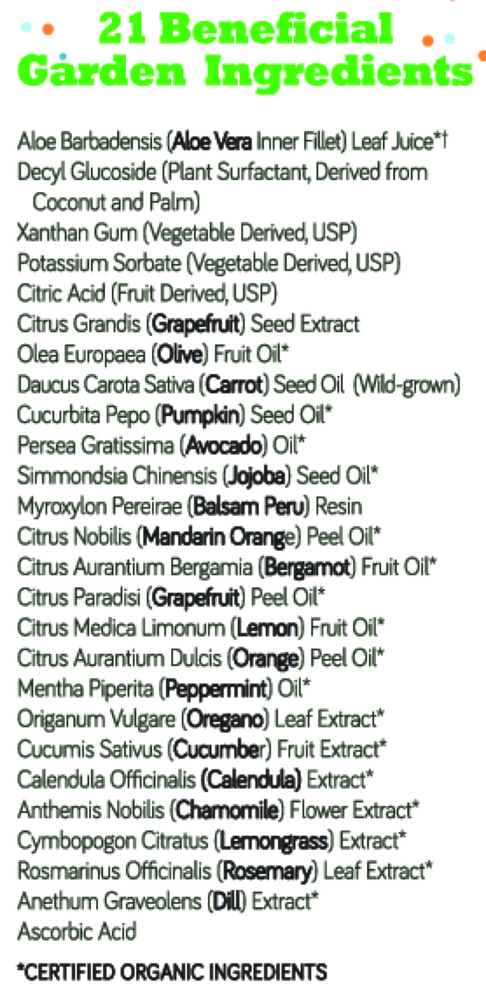 Safe, gentle and soothing Ruby-Blue Bunny Shampoo & Wash is naturally harsh chemical and detergent-free, making it perfect for a newborn's first bath, foamy fun baby bath-time, hand washing or cleaning the whole family from head-to-toe. The neutral pH is gentle on the eyes. Rich in natural 20 botanical garden ingredients, including, aloe, pumpkin, and carrot that are beneficial skin nourishing and soothing nutrients, and anti-oxidants. Certified endocrine-disruptor free and free of harsh chemicals.