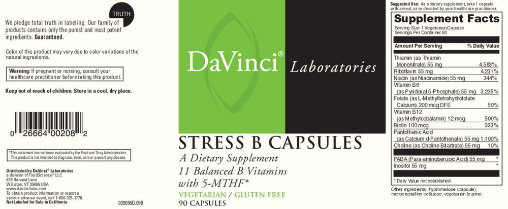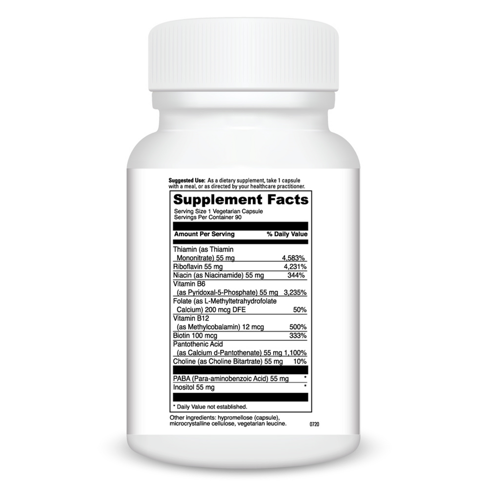 Stress B contains Thiamin (B1), Riboflavin (B2), Niacin (B3 asniacinimide), Vitamin B6, Folic Acid, Vitamin B12, Biotin, Pantothenic Acid (B5), PABA, Choline and Inositol to support proper nerve function and relaxation.* The Vitamin B complex in Stress B helps manage stress, support immune system function and helps reduce irritability.* B vitamins are important to proper circulatory function, for maintaining blood pressure within normal ranges, and preserving healthy cholesterol levels already in the normal range and proper homocysteine levels.* Available in a vegetarian, gluten free, and easy to swallow capsule.