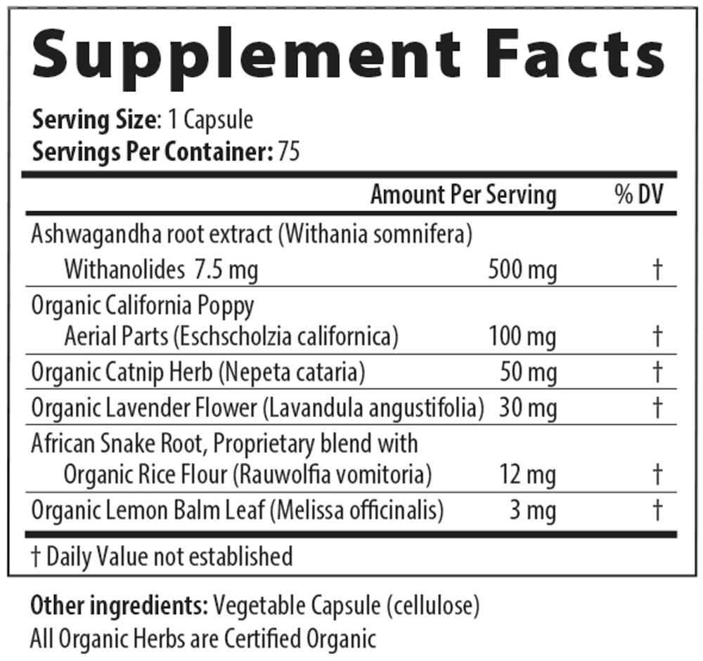 This herbal formula supports a sense of calm and preserves optimal central nervous system function. It contains adaptogenic herbs to assist with stress management. May help promote clarity and mental alertness.*