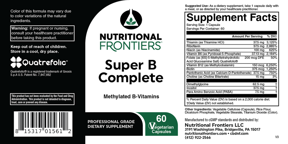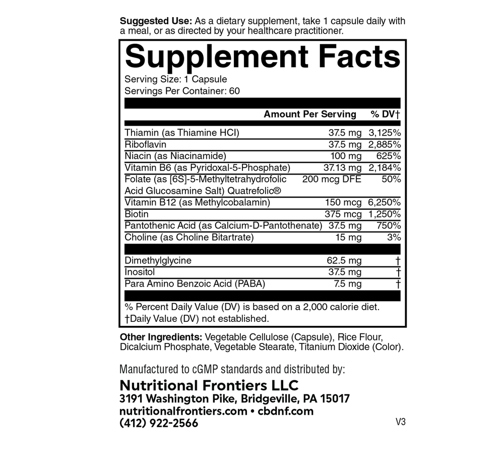 This unique, high quality formula contains the most biologically active forms of many B-vitamins including B12 in the form of methylcobalamin. B-vitamins play many important roles in the body. For example, vitamin B12 and folic acid (Quatrefolic®) are crucial for proper cell division; vitamins B1, B2, B3 and biotin are essential for energy production. Amino acid metabolism requires vitamin B6. Vitamin B5 is necessary for the synthesis of acetylcholine (a neurotransmitter) and is also involved with energy production.* Some B vitamins have been shown to play a role in wound healing.* Biotin is known to improve nail strength.*