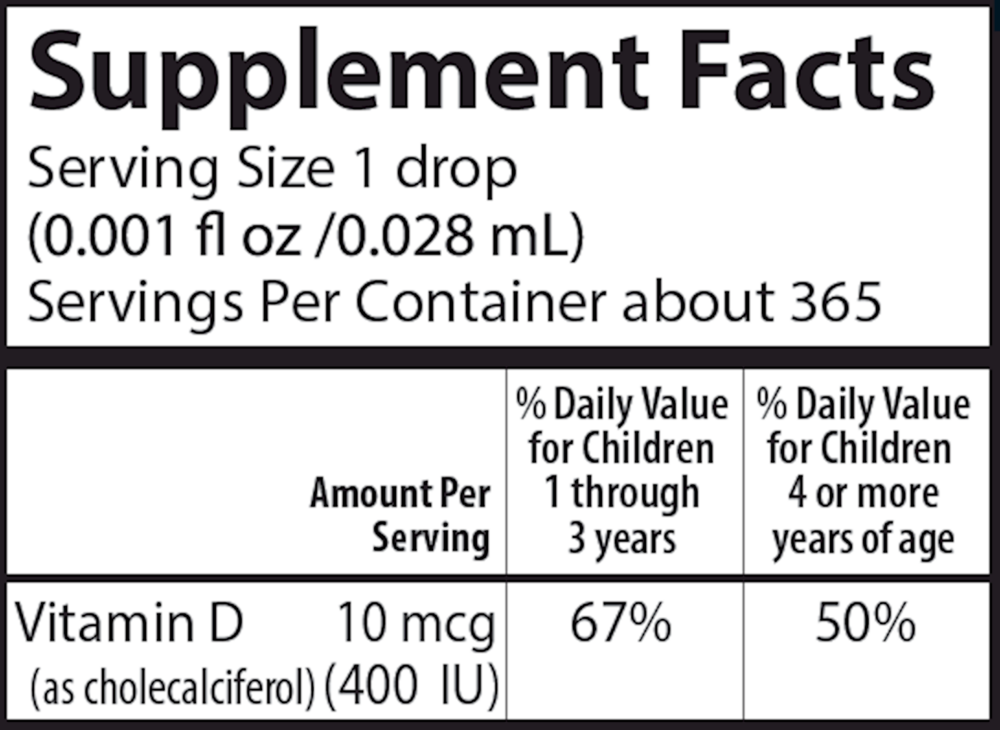• 400 IU (10 mcg) of concentrated vitamin D3 in each drop, the recommended daily intake of the American Academy of Pediatrics