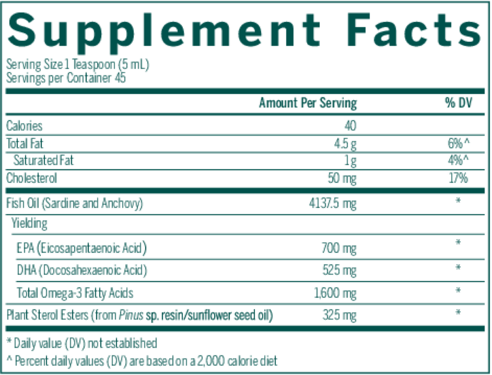 Recent research indicates that cardiovascular health may be better supported by diets high in monounsaturated fatty acids, plant sterols, and fish oils than by those high in fish oils alone. EPA, DHA, and plant sterols support healthy fatty acid metabolism. In randomized, placebo-controlled trials, daily supplementation with 1.3-1.4 g of EPA and DHA, in combination with 2-2.5 g of plant sterols, for three to four weeks supported healthy lipid metabolism. Super EFA Liquid Plus provides 1.6 g of EPA and DHA and 325 mg of plant sterols per serving to help support cardiovascular health.*