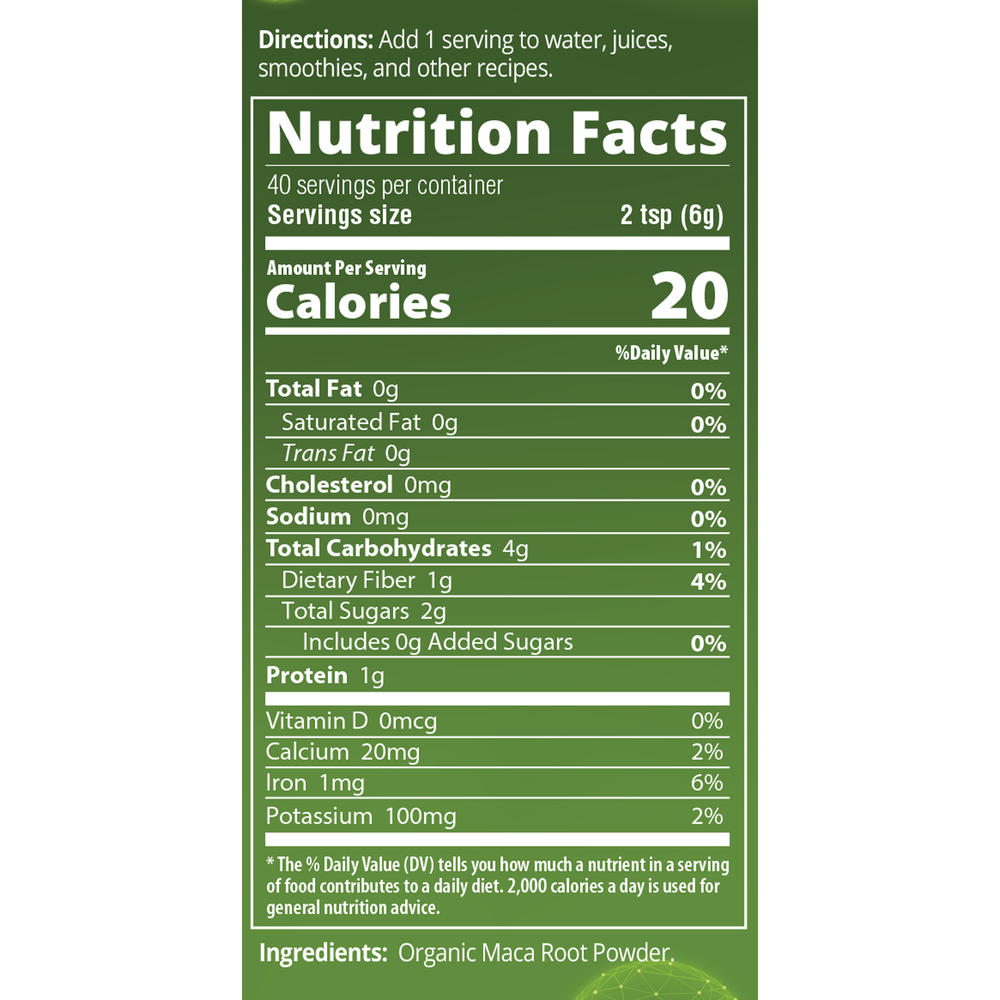 Maca root is a unique, complete food. It is in the same botanical family, the brassicas, as broccoli and kale but with maca the root is consumed, like radishes. It shares with other brassicas a content of glucosinolates, sulfur containing compounds with potent adaptogenic effects. Maca is rich in the dietary minerals calcium and potassium (with low content of sodium), and contains the essential trace elements iron, iodine, copper, manganese, and zinc, as well as both essential and non-essential fatty acids, and 19 amino acids.