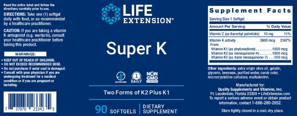 Life Extension's Super K combines vitamin K1 with two forms of vitamin K2 in a once-daily vitamin K supplement to help support bone & heart health.