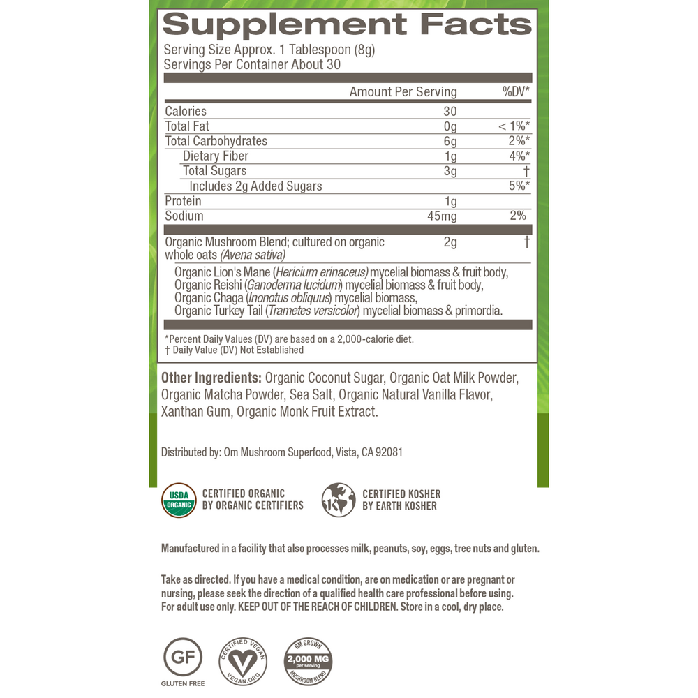 Each serving of Om Mushroom Matcha Latte Blend contains