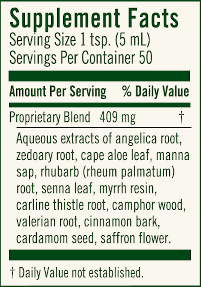 • Herbal bitters that help reduce occasional gas and bloating and stimulate digestion*