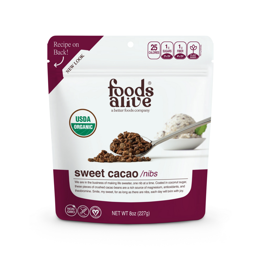 Food's Alive sweetened cacao nibs are versatile and nutrient-dense. They are created by crushing cacao beans into small pieces then lightly coating them with sweet organic coconut palm sugar.