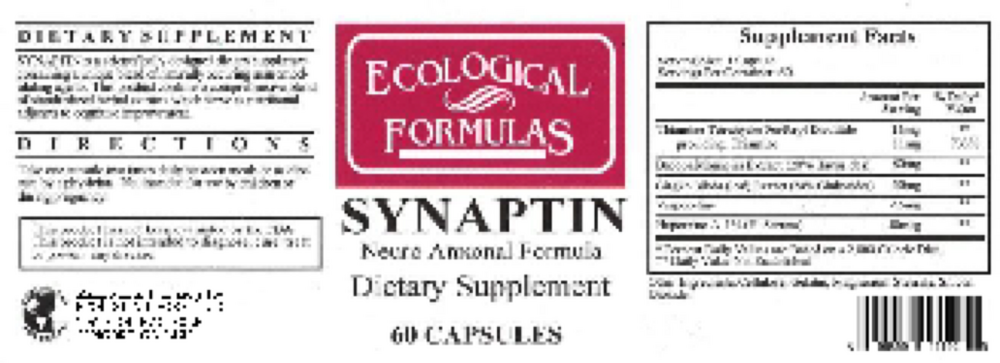 Synaptin by Ecological Formulas is a dietary supplement designed to provide support for cognitive functioning and brain health.* This supplement can be especially beneficial as the body ages.* Synaptin by Ecological Formulas contains a blend of potent herbal extracts proven effective at supporting memory, thinking and cognitive function.* These include ginkgo biloba, vitamin B1 or thiamine, Huperizine A and Bacopa monneira extract.
