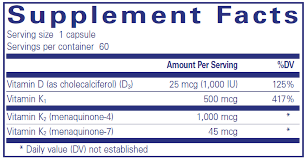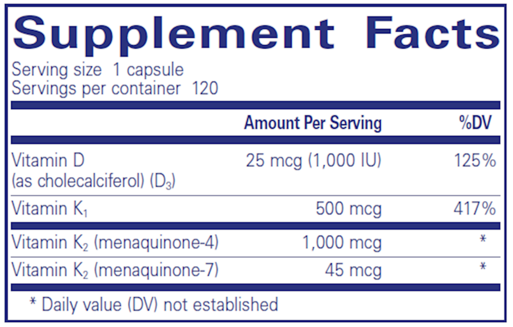 Provides a blend of vitamin K1, vitamin K2 (MK-4), vitamin K2 (MK-7), and vitamin D to support healthy calcium utilization. Recent studies indicate that vitamin D potentiates the activity of MGP and that the combination of vitamin K and D provides synergistic support for blood vessel function and bone health.*
