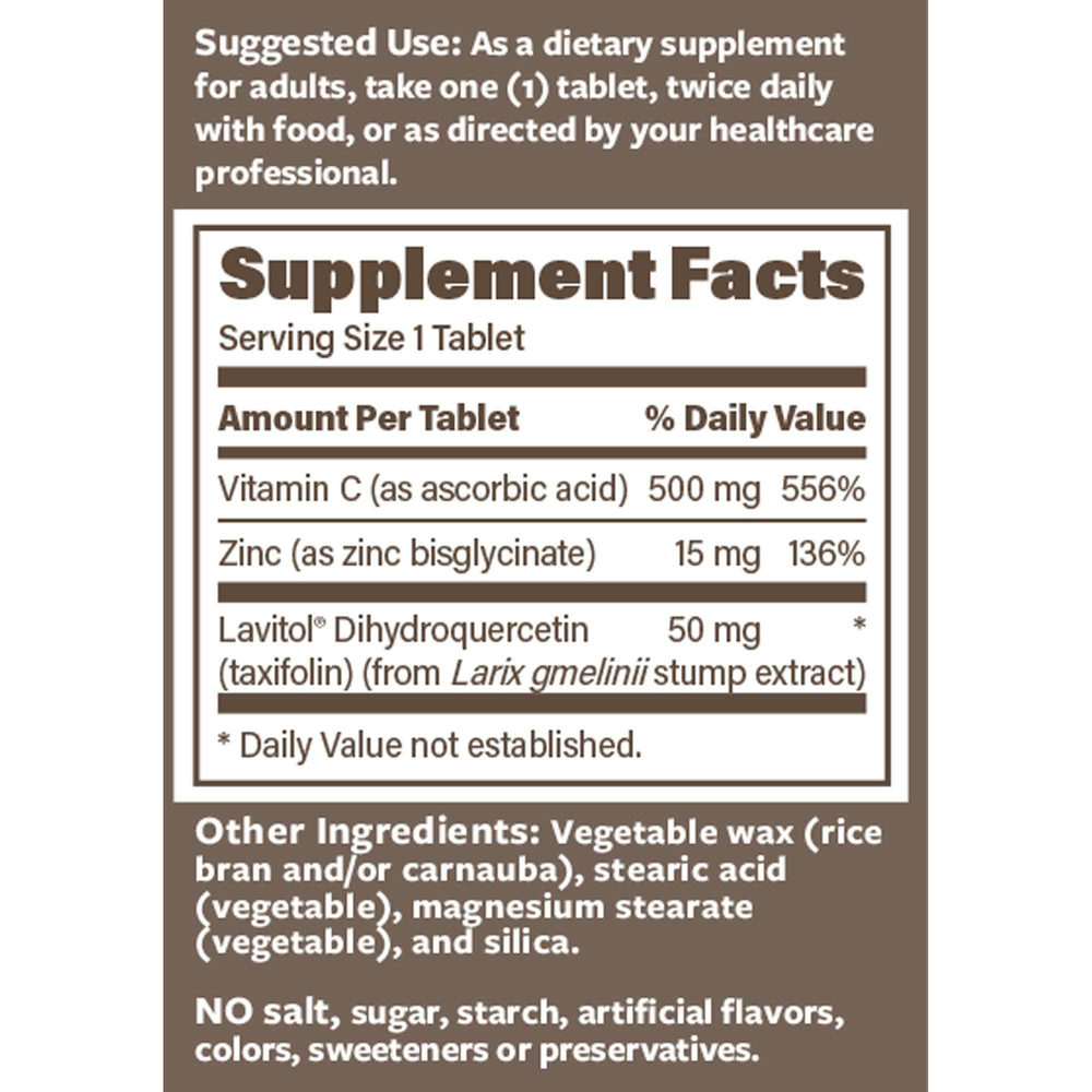Taxifolin Complex SR is ideal for men and women who want to take antioxidant protection and immune defense to the next level without compromising convenience.Taxifolin Complex SR features high-potency vitamin C, highly bioavailable zinc bisglycinate, and Lavitol® a patented bioflavonoid extract dihydroquercetin (taxifolin). Lavitol® dihydroquercetin is a prized plant antioxidant sourced from Dahurian larch trees native to Siberia, backed by an extensive safety evaluation, and affirmed GRAS (Generally Recognized as Safe) for use in foods and dietary supplements.*By using our proprietary vegetable wax-matrix tablet core, each sustained-release tablet slowly dissolves for a steady release of this powerful antioxidant trio over a period of 5 to 7 hours to promote optimal absorption and tissue retention.*