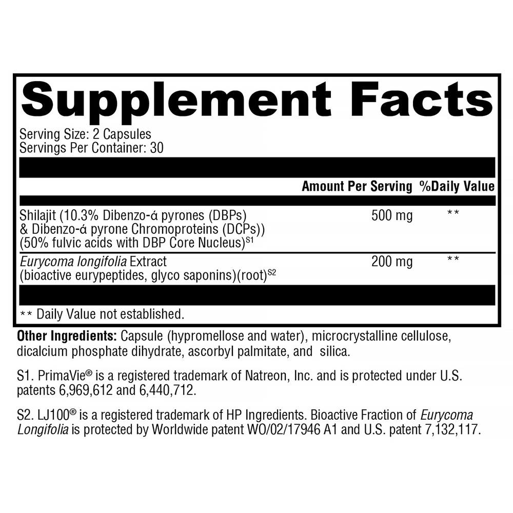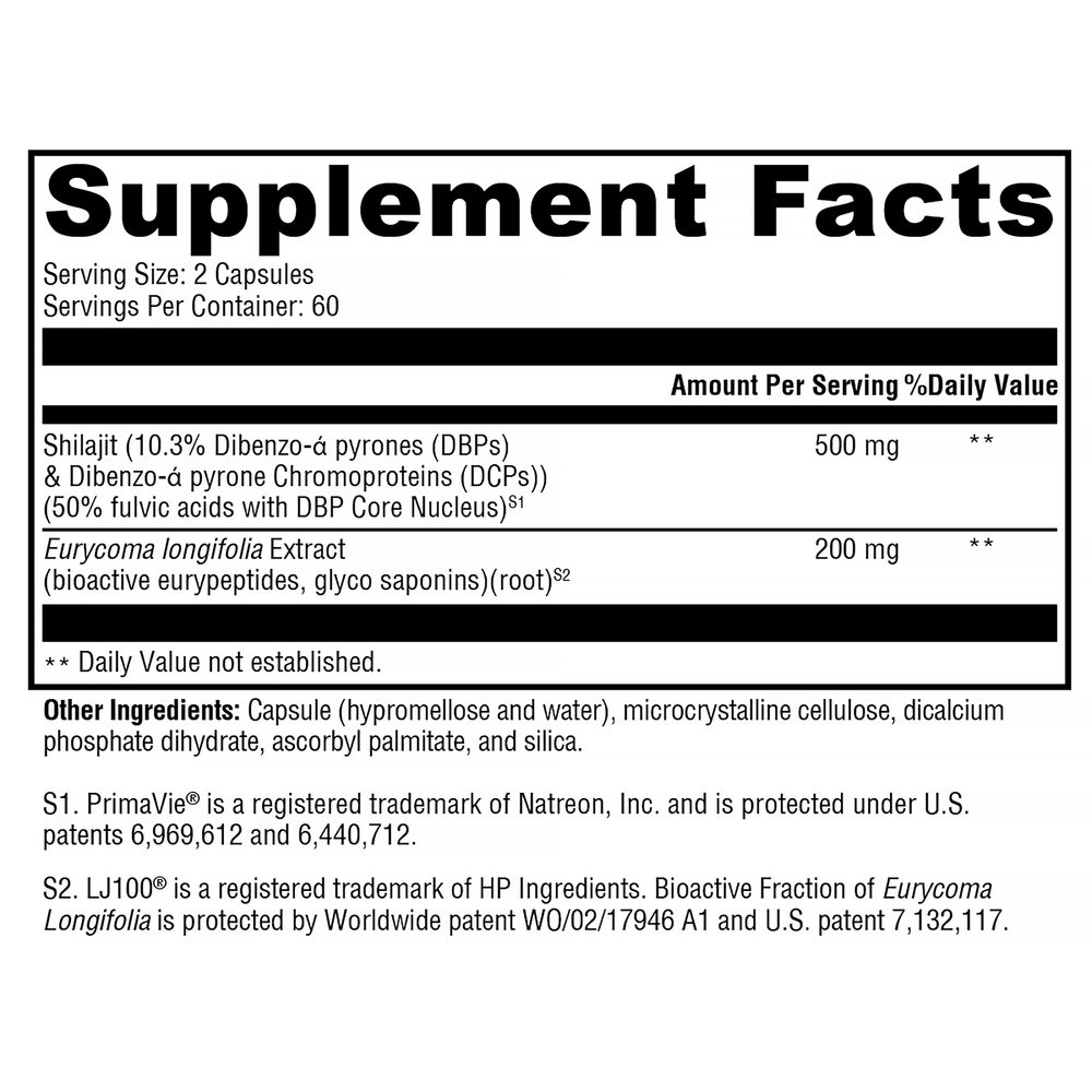 TestoPlex™ Plus features two safe, clinically-tested, standardized, and patented ingredients designed to support vitality and general physical and mental well-being in men and women. Numerous studies have demonstrated that PrimaVie® shilajit and LJ100® Eurycoma longifolia support healthy androgen biosynthesis, which includes modulating the influence of sex hormone-binding globulin.†