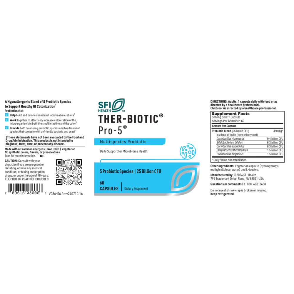 A high-CFU, hypoallergenic blend of 5 probiotic species, Pro-5® is designed for individuals who need a high degree of support to build and balance beneficial intestinal microbiota.* The 5 species in this formulation—Lactobacillus rhamnosus, Lactobacillus acidophilus, Bifidobacterium bifidum, Streptococcus thermophilus, and Lactobacillus bulgaricus—work together to effectively increase colonization of the microorganisms in both the small intestine and the colon.*