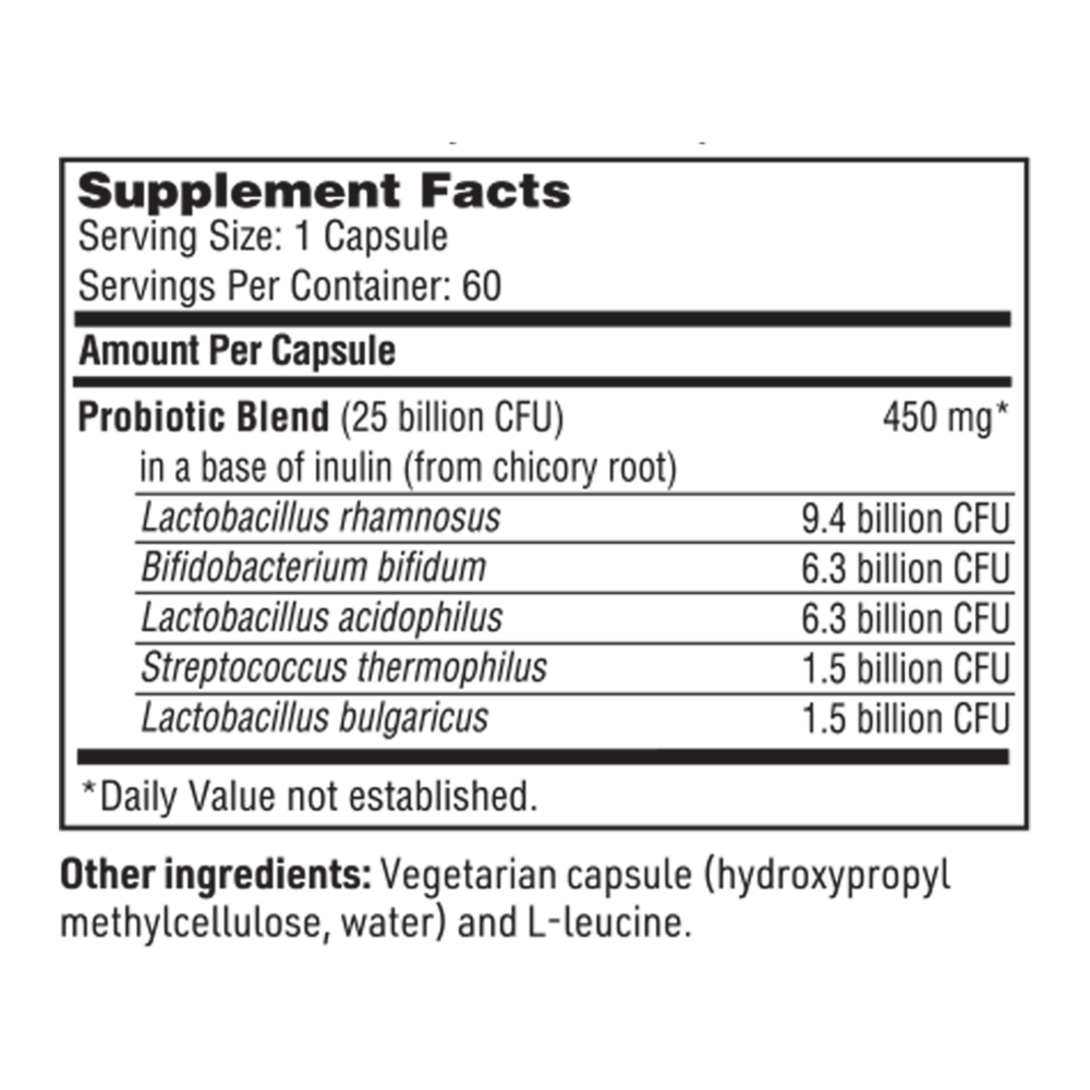 The transient and colonizing species in this combination have high tolerance to stomach acid and bile, which is important for maintaining viability in the intestinal environment. Pro-5® is an excellent, cost-effective option for supplementation with powerful amounts of primary, broadacting resident and colonizing probiotic species complemented by two transient species that compete against undesireable bacteria and yeast.* Supplies 25 billion CFUs per capsule.