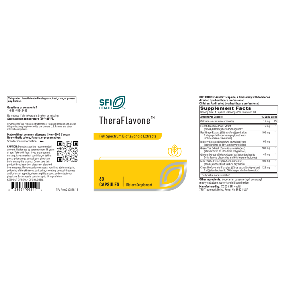 There are so many useful flavonoidrich plant extracts that it can be difficult and costly to take them individually when a balanced and broad-based protective approach is desired. TheraFlavone™ is specially formulated to provide a wide selection of different extracts with well-documented biochemical actions. Only full-spectrum extracts, not isolated flavonoids, are included thus preserving the synergistic activity of the full complement of phytonutrient compounds. TheraFlavone™ is a powerful formula providing support for immune function, circulatory health, liver detoxification mechanisms, and antioxidant pathways.* Two capsules are equivalent to 10 to 12 tablets or capsules of individual extracts taken separately.