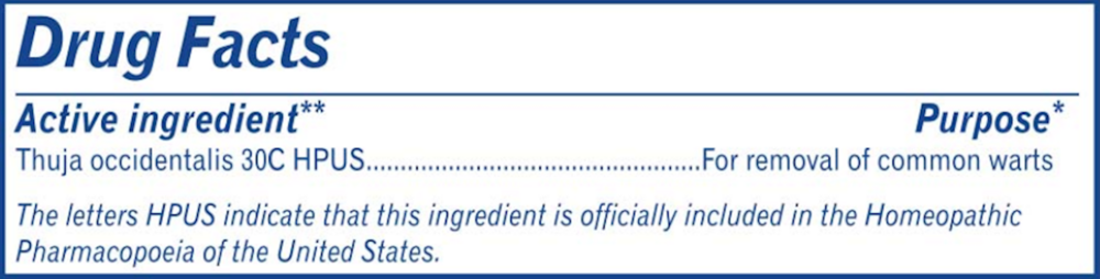 Customize your care with Boiron single medicines for highly targeted relief. Thuja Occidentalis 30C is a homeopathic medicine that relieves warts.*The pellets melt in your mouth and can be taken on the go, no food or water needed. They come in an easy dispensing tube of approx. 80 pellets (16 doses). Boiron single medicines are ideal for adults and children and do not contain artificial colors, flavors, sweeteners, or preservatives. Always use according to the label instructions unless directed by your health care professional.With more than 90 years of expertise, Boiron is a trusted brand that prides itself on quality manufacturing and responsible environmental practices. All products are made according to the highest standards of cGMP and formulated with HPUS ingredients for purity.