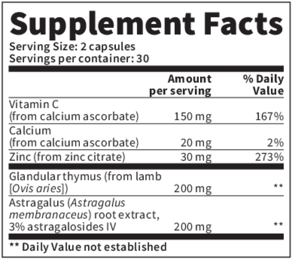Ingredient Quantity Calcium Ascorbate 170 mg Zinc Citrate 30 mg Astragalus 194 mg Astragalosides 6 mg lamb [Ovis aries] 200 mg Other Ingredients: Microcrystalline cellulose, hypromellose, purified water, vegetable magnesium stearate, and silicon dioxide.Serving size: 2 Capsule
