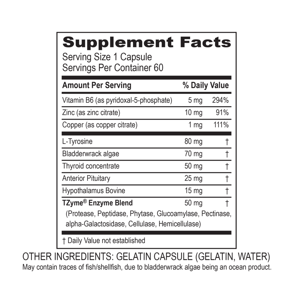 • Nutritional Support. This natural formula contains various vitamins and minerals such as Vitamin B6, Zinc, and Copper known to be specific for thyroid health and includes Bladderwrack for additional nutritional support.*