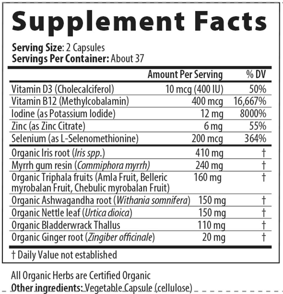 Features herbs and nutrients to support thyroid function. This formula is the most potent support Restorative Formulations offers for healthy thyroid function. Provides the thyroid with the required nutrition and substrates. Supplies the building blocks for T3/T4 hormone synthesis. Promotes the activation of thyroid hormone.*• Supports Metabolism*