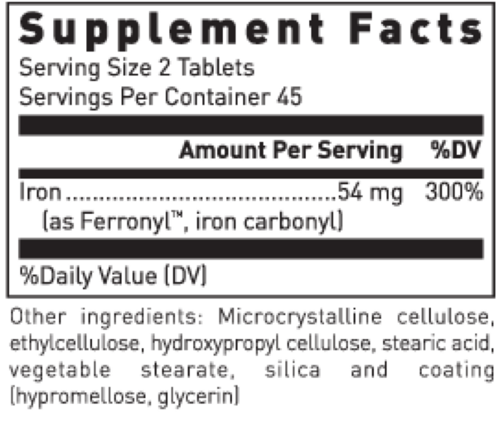 Timed Release Iron tablets are specially designed to provide 54 mg of iron carbonyl (Ferronyl®) per serving. Carbonyl iron is well-tolerated, easily absorbed, and has a low toxicity.