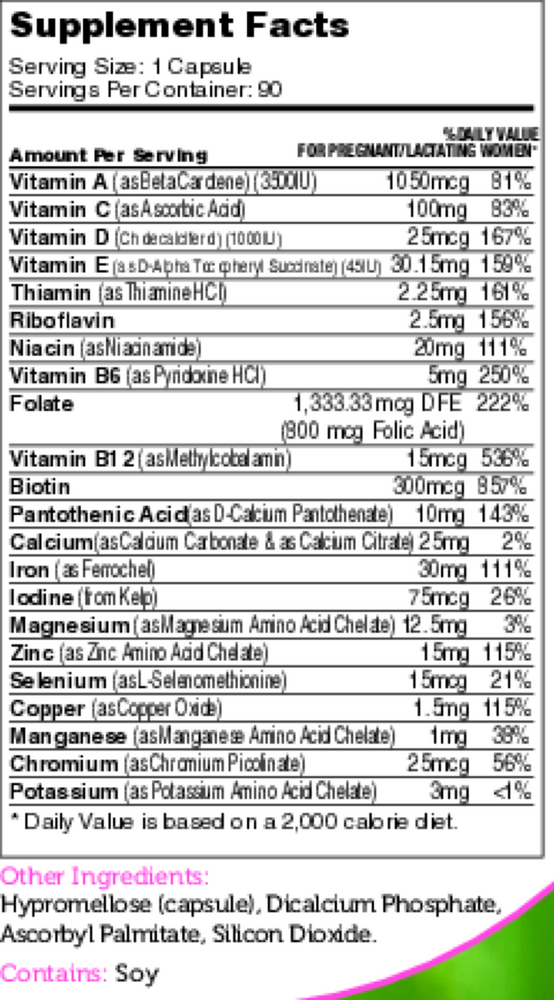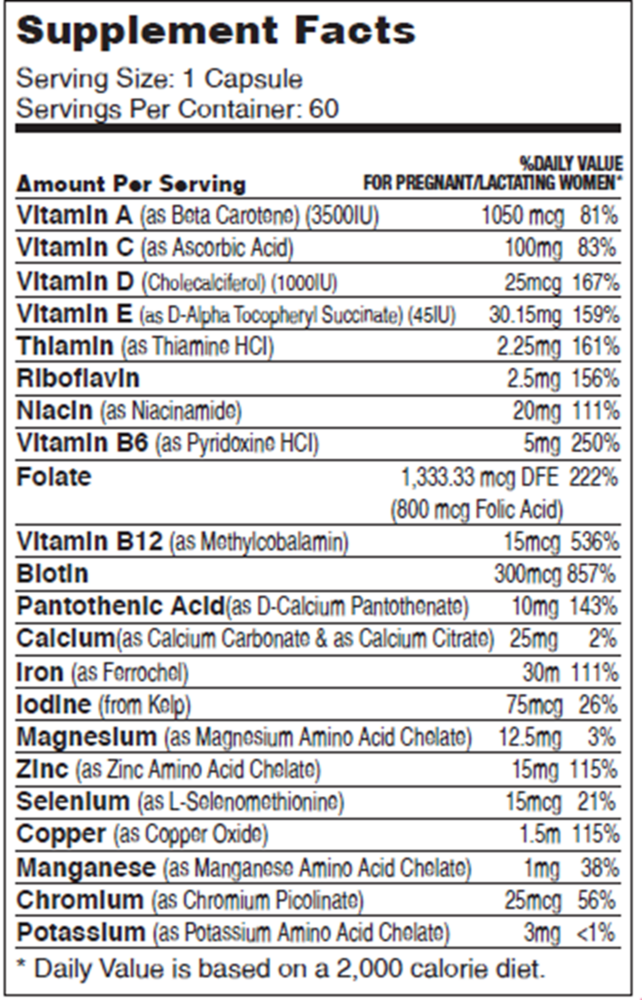 Total One Prenatal, which includes Calcium, Folate, Chromium and more, provides optimum nutrition during pregnancy in a convenient once-daily capsule. It can be taken while nursing as well as during pregnancy, providing nutritional fortification that benefits both mother and baby. During the early months of pregnancy, the developing fetus uses essential nutrients to form cells and organs. The absence of these nutrients can result in permanent birth defects.