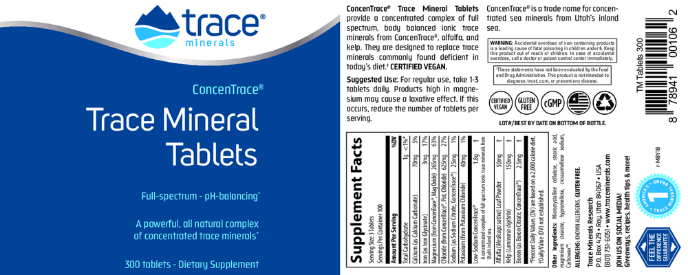 Low sodium ConcenTrace® Trace Mineral Tablets is the most powerful natural health mineral supplement in the world. It’s impossible to overestimate the importance of minerals and trace minerals for the human body. They are the catalysts for all the vitamins and other nutrients your body uses for developing and maintaining good health.* ConcenTrace® Trace Mineral Tablets captures the perfect balance of those minerals. Using ConcenTrace® every day will help maintain the healthy function of your body’s entire electrical system.* It will help your body maintain peak energy stores.*