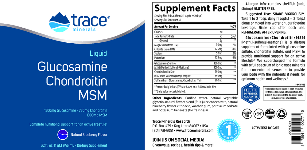 Glucosamine/Chondroitin/MSM (Methyl-sulfonyl-methane) with ConcenTrace® is a dietary supplement that provides nutritional support for joints and connective tissue.* Glucosamine sulfate combined with chondroitin supplies cartilage with the vital building blocks it needs to stay supple and healthy.* MSM is a natural sulfur compound the body critically needs to maintain proper joint health.* Supercharged with ConcenTrace® for improved absorption, this formula provides your body with the nutrients it needs to support healthy joints.*