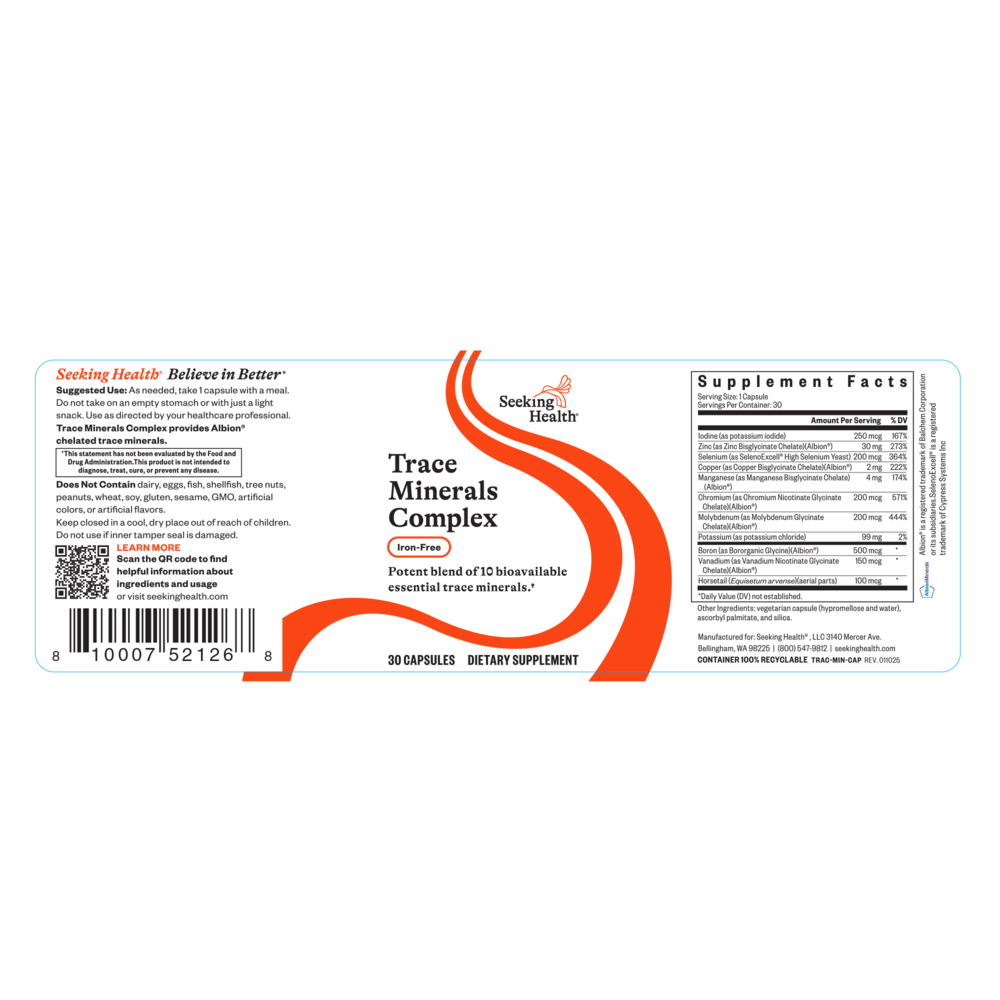 Trace Minerals Complex by Seeking Health provides 10 essential trace elements in forms that are well-tolerated and easily absorbed, plus silica from horsetail. Iron is excluded, as routine iron supplementation is not required by the majority of adult men and women. Trace minerals, or “microminerals,” are important nutrients that the body needs in small amounts to maintain proper function. Typically taken up from the soil by plants, trace minerals may be lacking in the modern diet due to decreasing nutrient content in the soils used in commercial farming.*