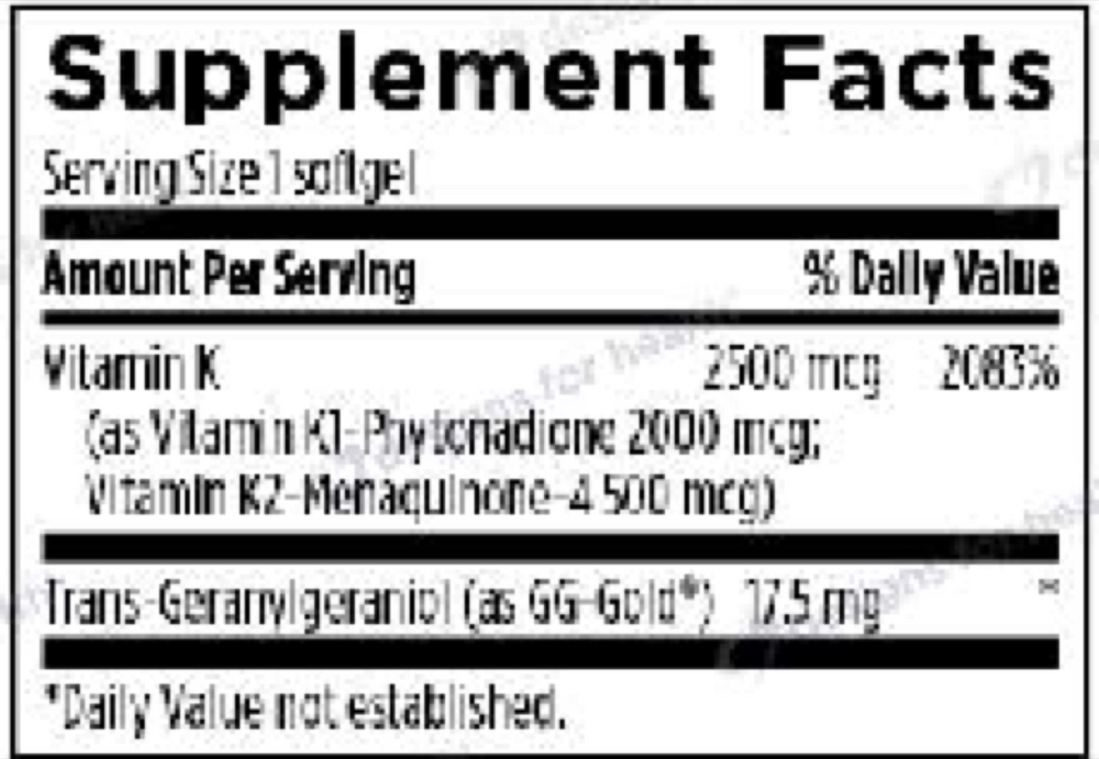 Tri-K™ is a synergistic blend of vitamins K1 and K2, along with geranylgeraniol (GG) that work together to promote optimal delivery of vitamin K2 (as MK-4) to tissues supporting normal blood clotting, bone mineralization, and arterial elasticity.* Each 1-softgel serving delivers 2,000 mcg of vitamin K1 (as phytonadione), 500 mcg of vitamin K2 (as menaquinone-4 [MK-4]), and 17.5 mg of GG-Gold®, a patented form of GG, to support vitamin K status in the body.*