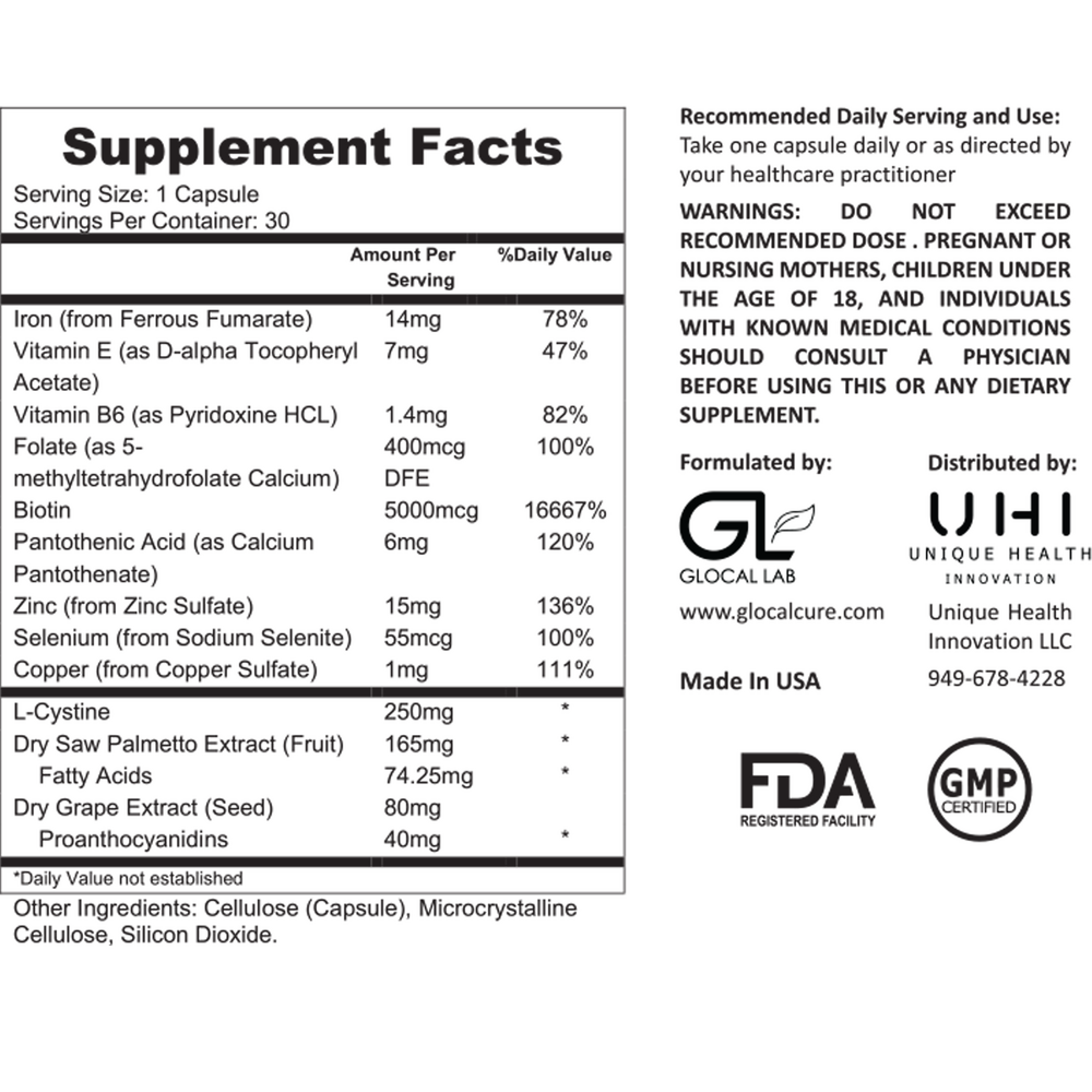 Tricho GlocalCure is a comprehensive nutraceutical supplement for hormonal and non-hormonal hair growth management, supporting follicular strength, scalp health, and anagen phase activation. It promotes and complements other hair restoration procedures.* (Beta-Sitosterol, Saw Palmetto Extract, Proanthocyanidins, L-Cystine, Biotin, Zinc, Vitamin B6, Folic Acid)