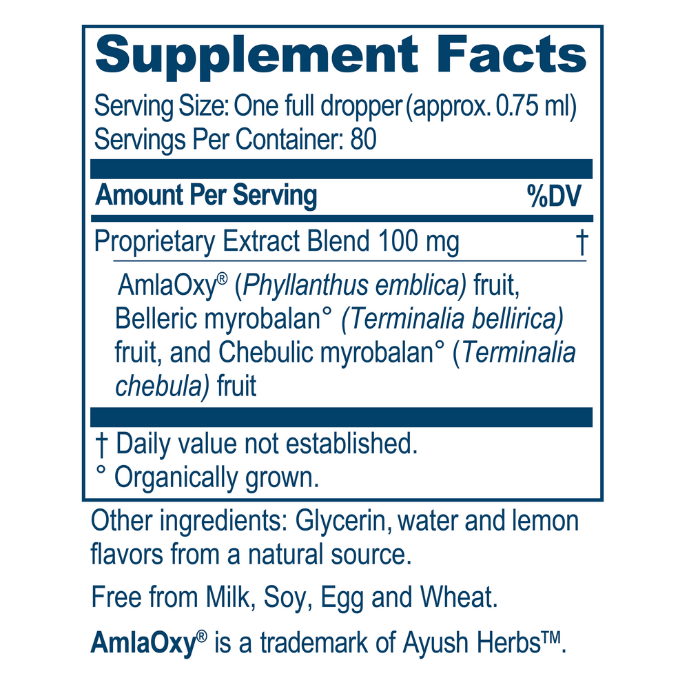 Kids Trifal™ DROPS are a combination of three herbs – Terminalia chebula (Haritaki), Terminalia belerica (Bahera), and Emblica officinalis (AMLAOXY®). This combination is referred to in almost every Ayurvedic textbook and is considered to be adaptogenic. This combination has synergistic action, and provides digestive and elimination support. It is also considered to have antioxidant properties. Terminalia chebula contributes tannins, amino acids, succinic acid, and beta-sitosterol. Emblica officinalis supports the immune system and is one of the best known sources of ascorbinogen. Trifal™ has bowel-regulating properties and is excellent for relief of occasional constipation, while aiding both digestion and elimination. The herbal combination in Trifal has long been considered a secret of longevity and robust health in Ayurvedic practice. Triphala has also been used in Ayurveda to promote healthy eyes.