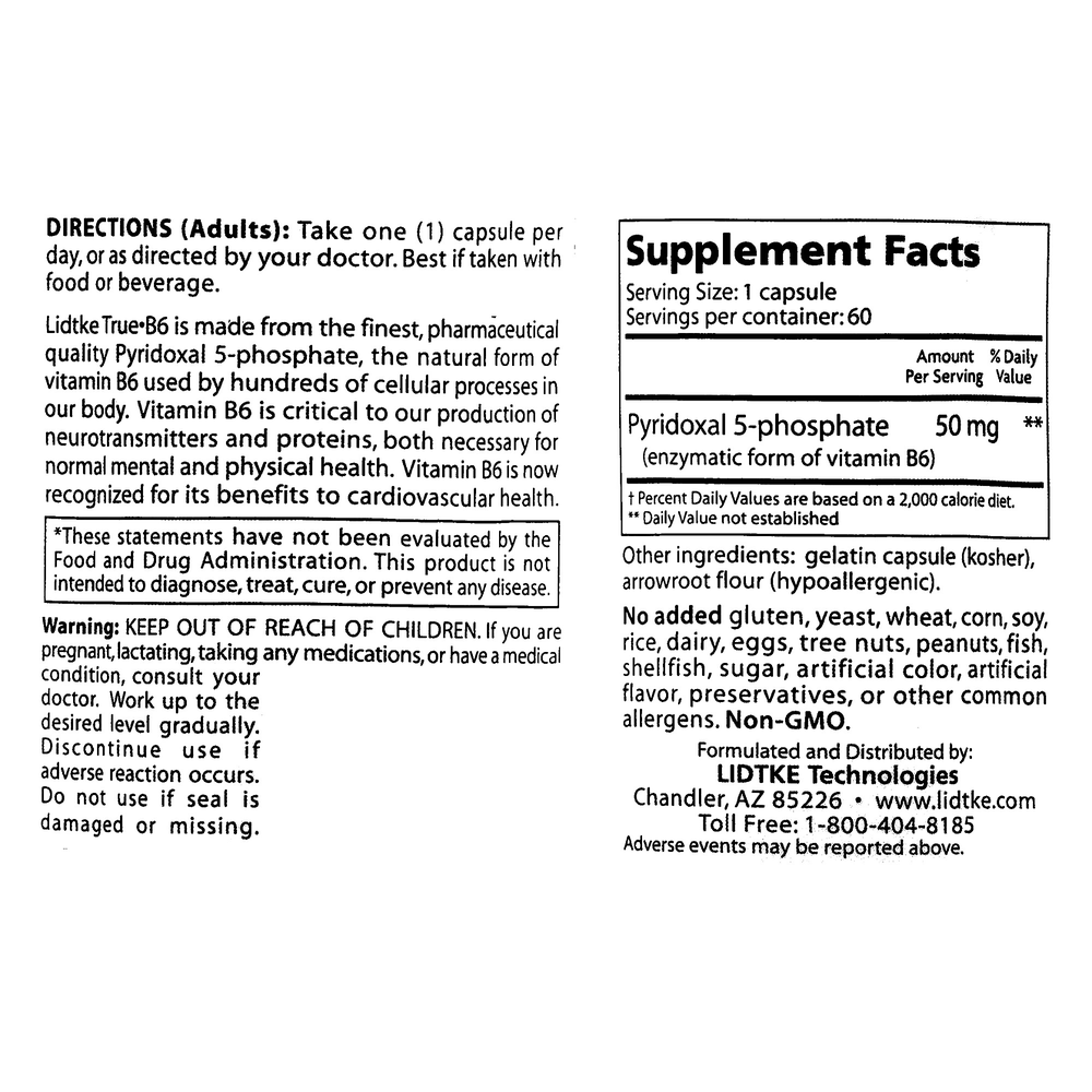 Lidtke® True-B6 is made from 100% fine quality Pyridoxal 5-phosphate (P5P), the natural form of vitamin B6 used by hundreds of cellular processes in your body.*