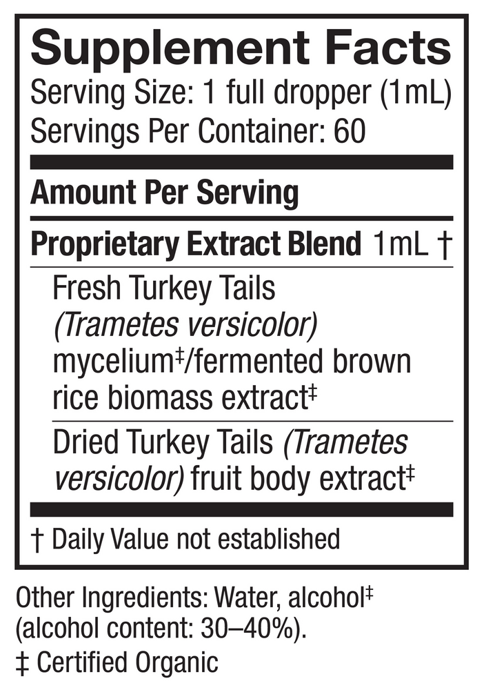 Host Defense® Turkey Tail Extract uses activated, freeze-dried, Certified Organic mushroom mycelium and fruitbodies, with a full spectrum of constituents: polysaccharides (beta glucans, arabinoxylane, fucose, glucose, xylose, galactose and mannose), glycoproteins, ergosterols, triterpenoids and other myco-nutrients, which are essential for Supporting Natural Immunity* and the natural microbiome.