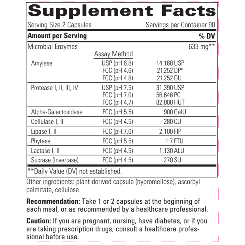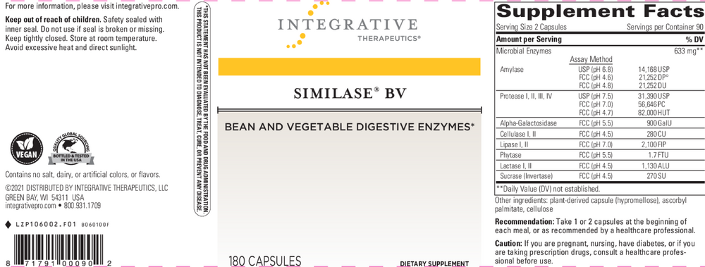 Similase BV is a comprehensive, Microbial Enzyme supplement that aids in the digestion of all food groups, while also providing additional enzyme activity for the digestion of beans, legumes and cruciferous vegetables (e.g. broccoli, cabbage, and Brussel sprout) that produce gas in sensitive individuals.* Similase® BV features alpha-galactosidase to support the breakdown of difficult to digest sugars and oligosaccharides in offending foods.* This product is not intended to diagnose, treat, cure, or prevent any disease.